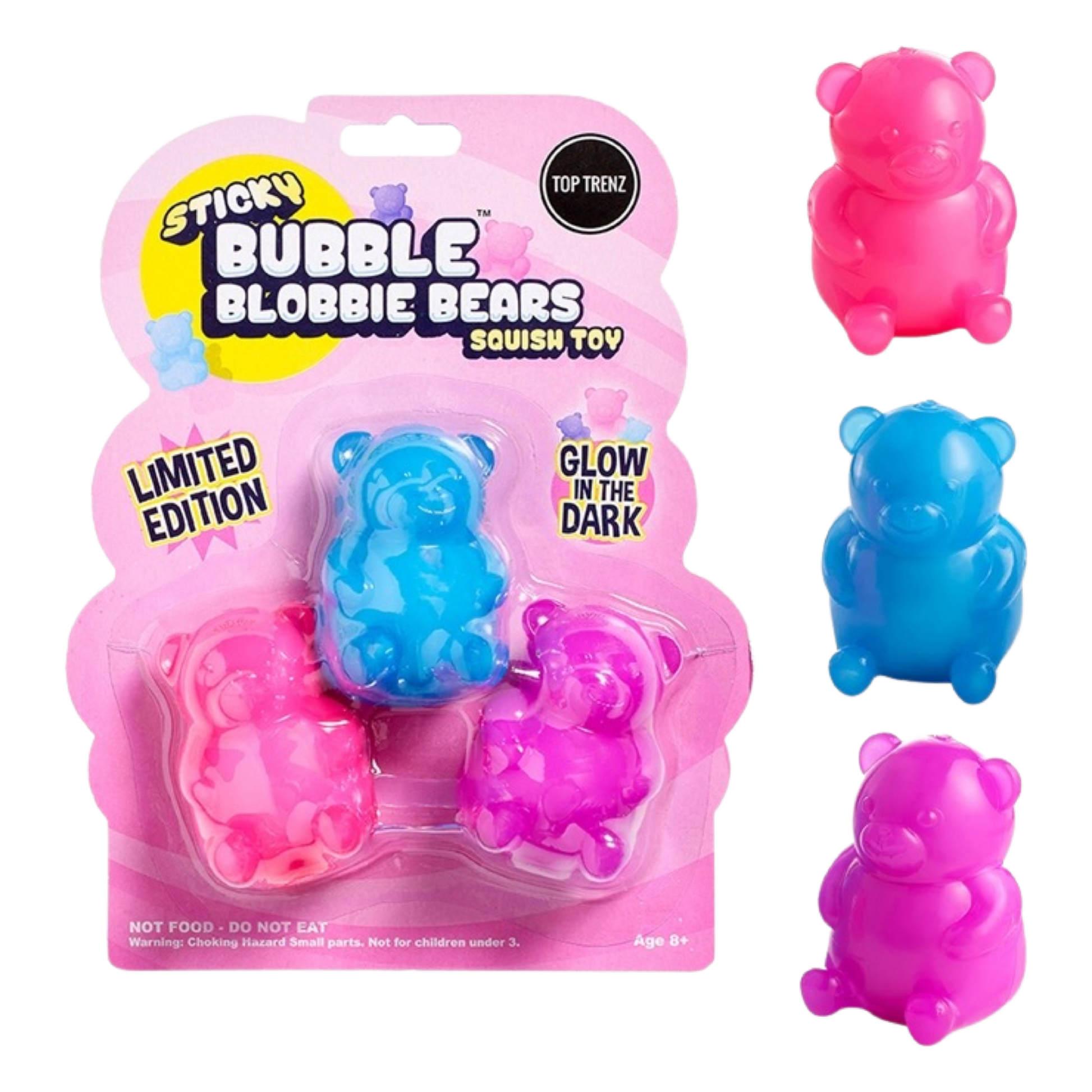 Squish, Stretch & toss! Watch them crawl the wall! The squishy Gummy Bear ball you can squeeze, stack, stretch and stick to the wall. Sticky Bubble Blobbies never lose their stickiness, even after you wash them and leave no sticky residue. Toss it on the wall and watch them crawl. Wash with soap and water to clean and refresh the stickiness.
