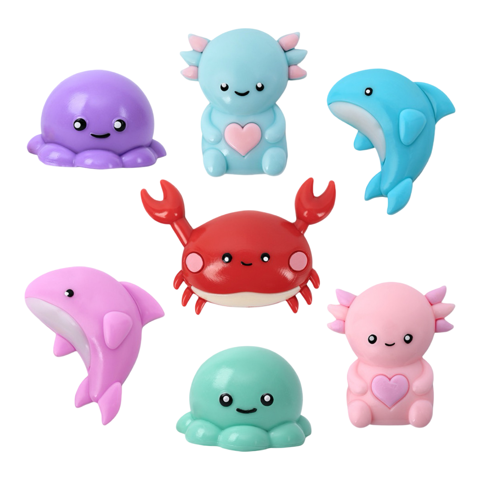 Collect all 7 sea life characters: axolotl, crab, dolphin, shark, turtle, octopus, and seal. These squishy fidget toys are gift-ready for birthdays, party favors, and classroom treasure boxes. If they pick up lint, just rinse with water to refresh.